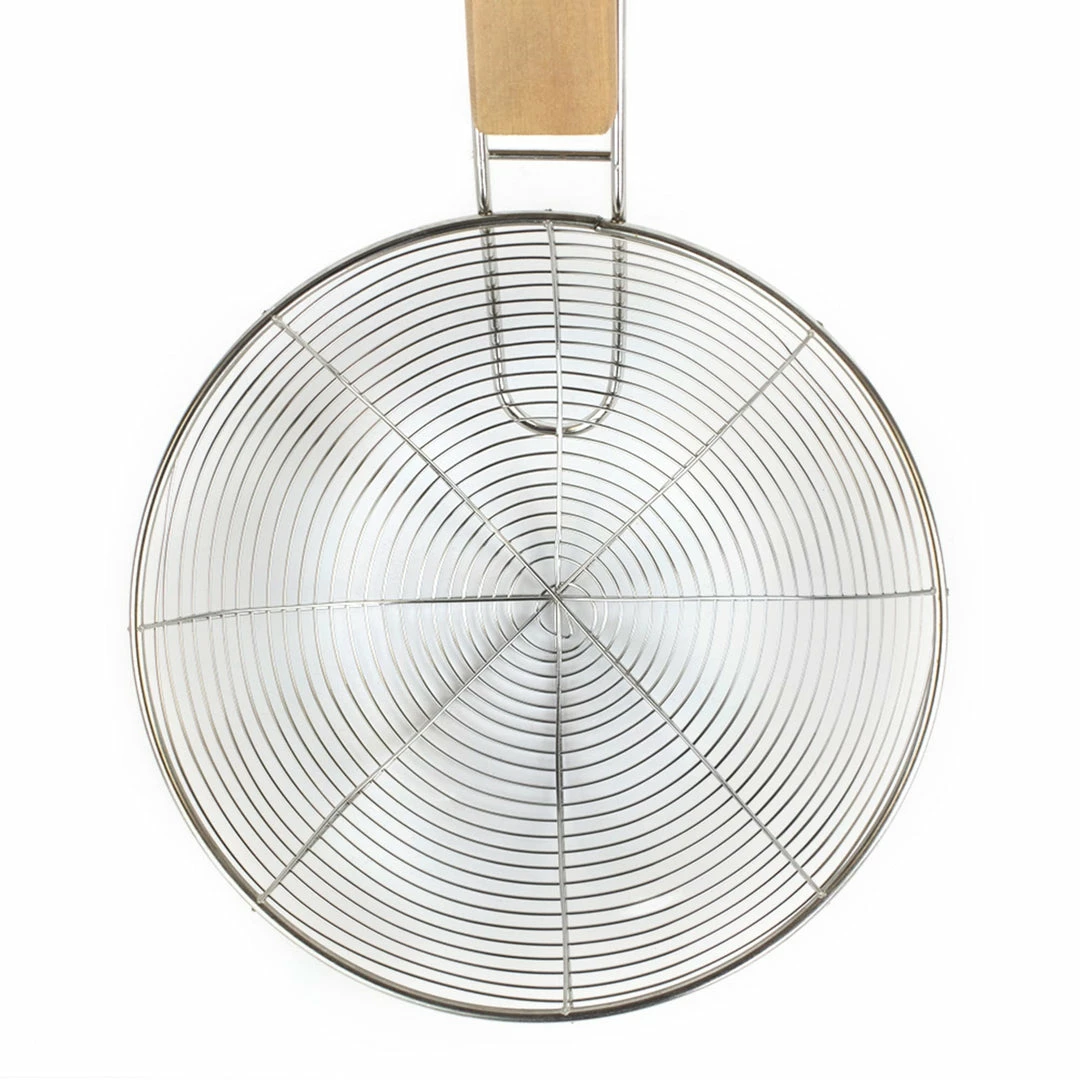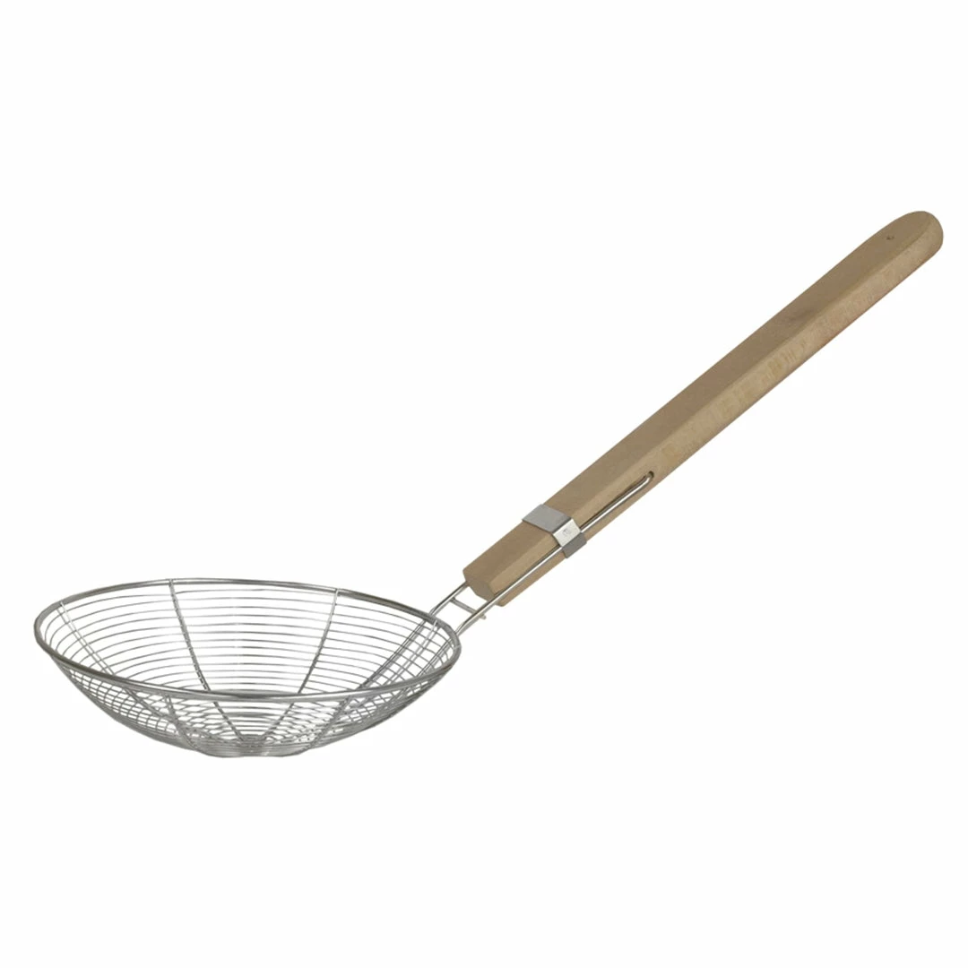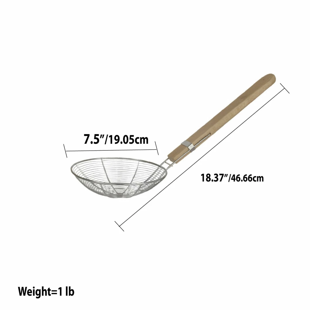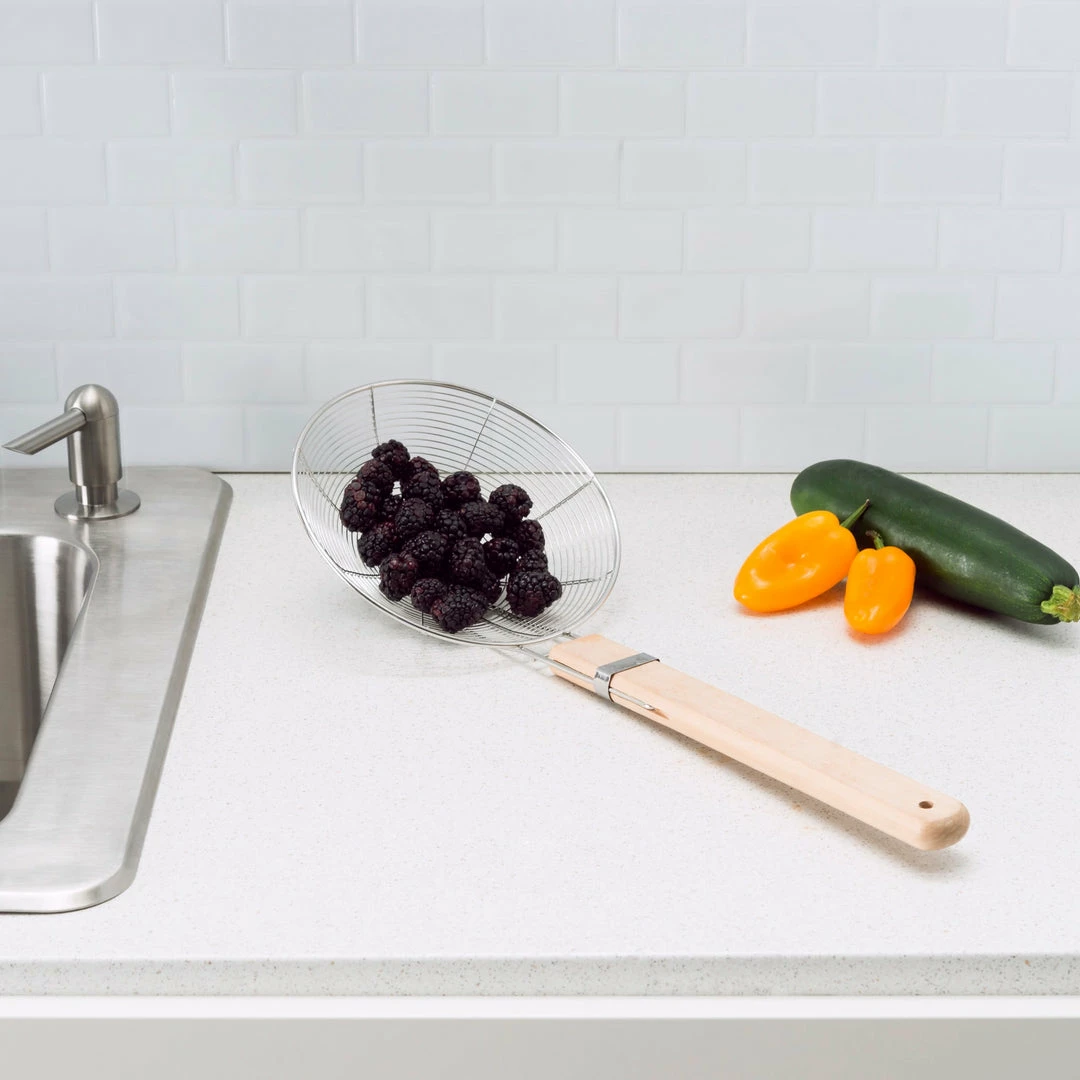 Safely scoop, drain, hot oils and liquids with this mesh steel strainer with wooden handle. The 7.5 inch diameter basket allows food to sit securely in place, eliminating splatters and mess. A must-have kitchen gadget for any home cook or advanced chef, this cooking strainer is perfect to use for deep frying, making different types of pasta and more. It is equipped with a wooden handle with a hole on the end to easily hang on a kitchen rack when not in use. Its long handle measures 11.5″, keeping your hands protected from oil and boiling hot cooking liquid splatters.