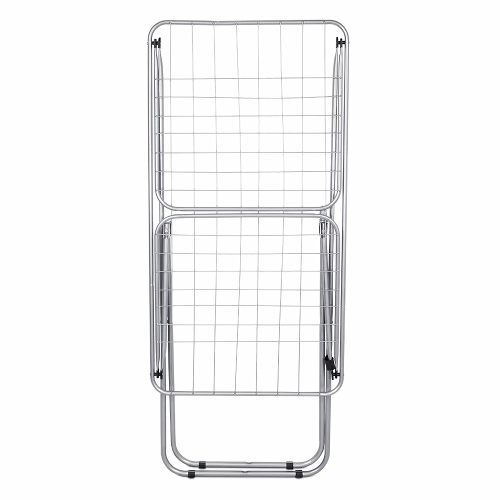 Conserve energy and ensure your garments remain in tip top shape with this metal clothes drying rack. Made from heavy duty enamel coated steel, it features 18 rods to hold and air dry a wide range of clothes. The side compartments are ideal for storing t-shirts, while the middle section is great for storing bath towels. It is collapsible when it is not in use, making it easy to store in your closet or under the bed. It is made of steel, making it durable for both indoor and outdoor use. Spot clean for easy maintenance.