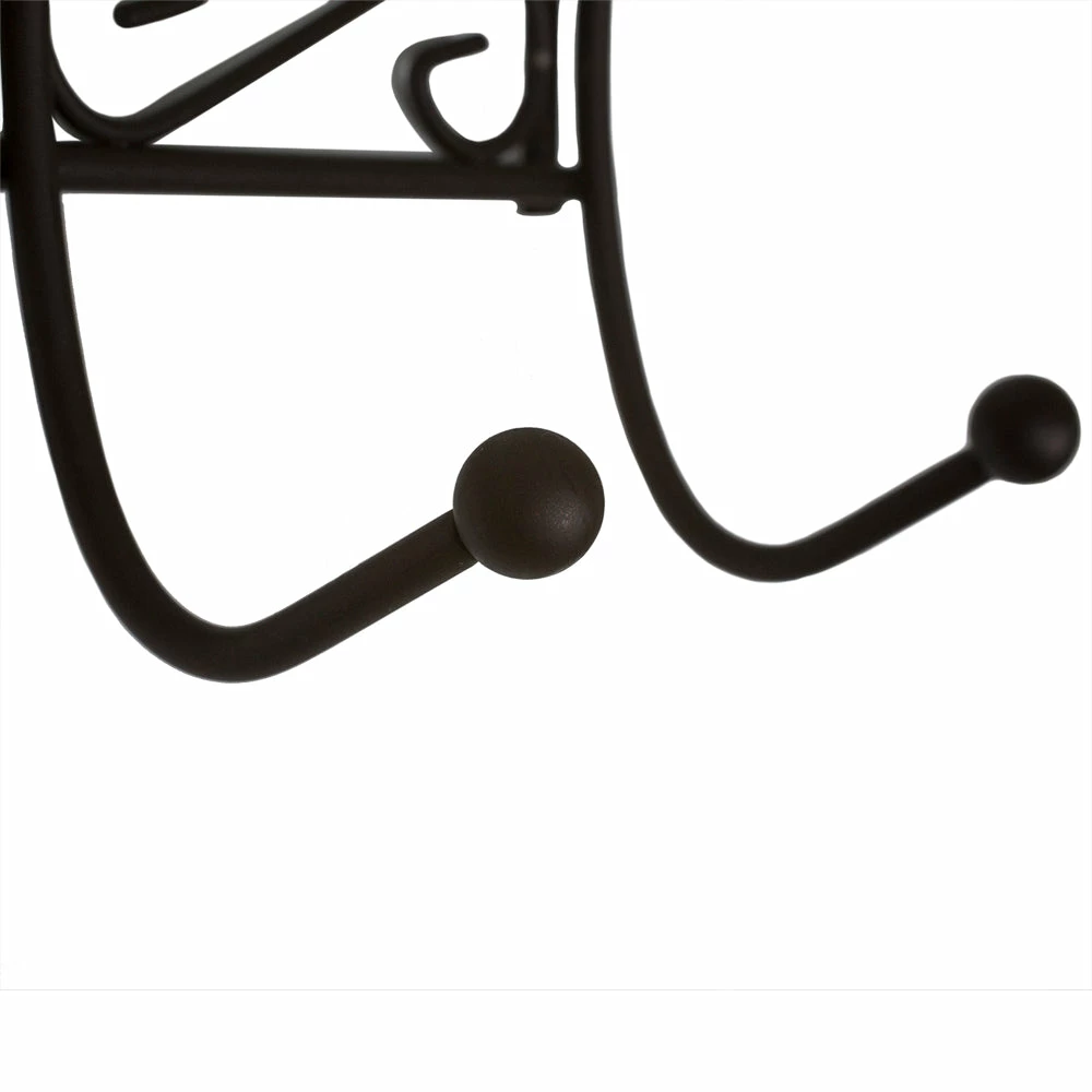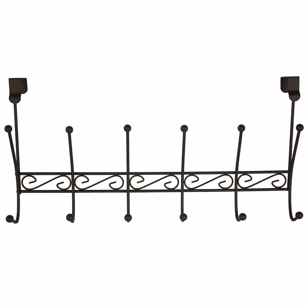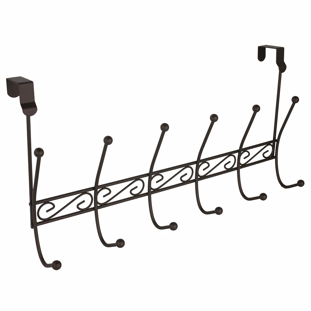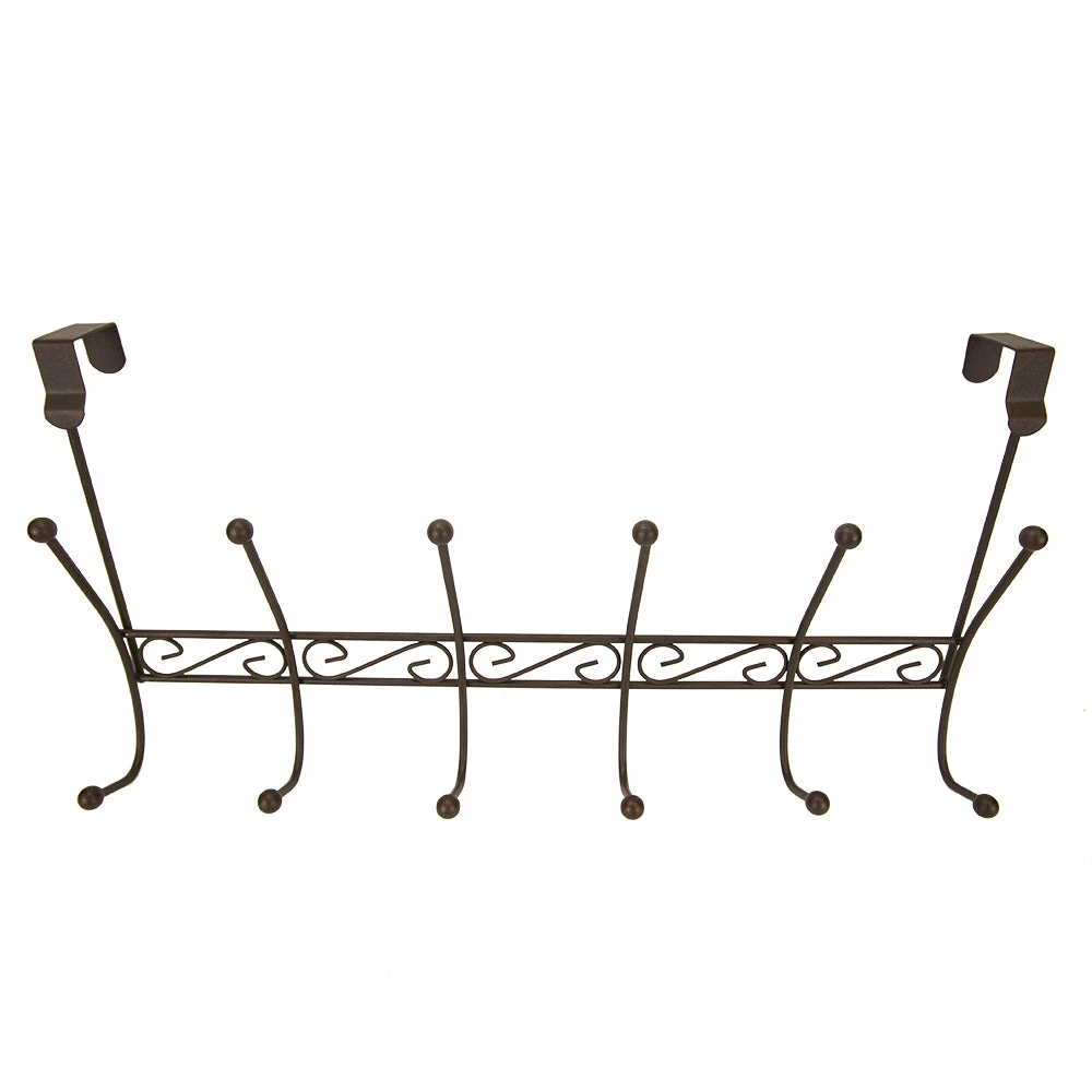 Forget stuffing those puffy winter jackets in those cramped closets, and grace your walls with a classic chic touch by displaying this over the door hanging rack on your interior walls. With 6 curved hooks, you can easily hang purses and accessories, garments, and even an entire wardrobe. The ornate scrolled frame lends a charming Victorian flair, while the lustrous bronze finish adds a rich contrast.