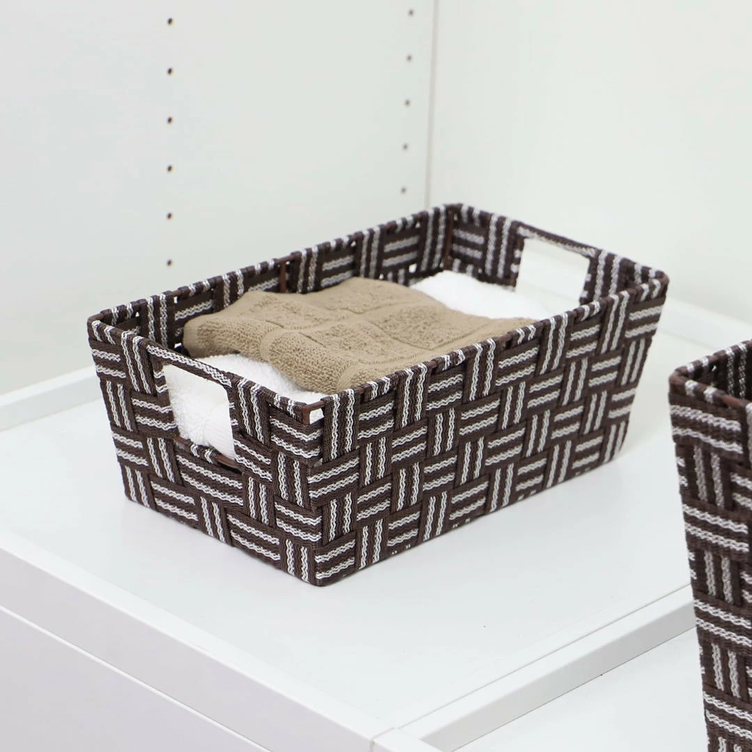 Lightweight and exceptionally strong, it features durable polypropylene strips woven over a strong internal metal frame that help maintain the binβs structure. With integrated handles you can move the bin around as needed. Easily pull out from empty shelf. Or lift from a top shelf. An open top allows you to grab what you need, while the tight, decorative weave keeps the clutter out of the way. In the living room use to corral charging cables and cords, keys, and small electronic devices. Place in the kids room to tame the unruly toys, arts and crafts, and books. Utilize in the bathroom to organize spare towels and toiletries. Wipe the surface clean to keep it looking its best. Item dimensions may differ slightly due to the unique nature of the product. Color and finish may also differ from the images shown due to differences in monitor displays. Props and accessories are not included.