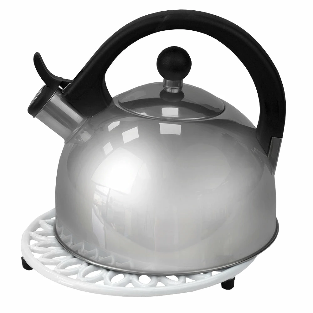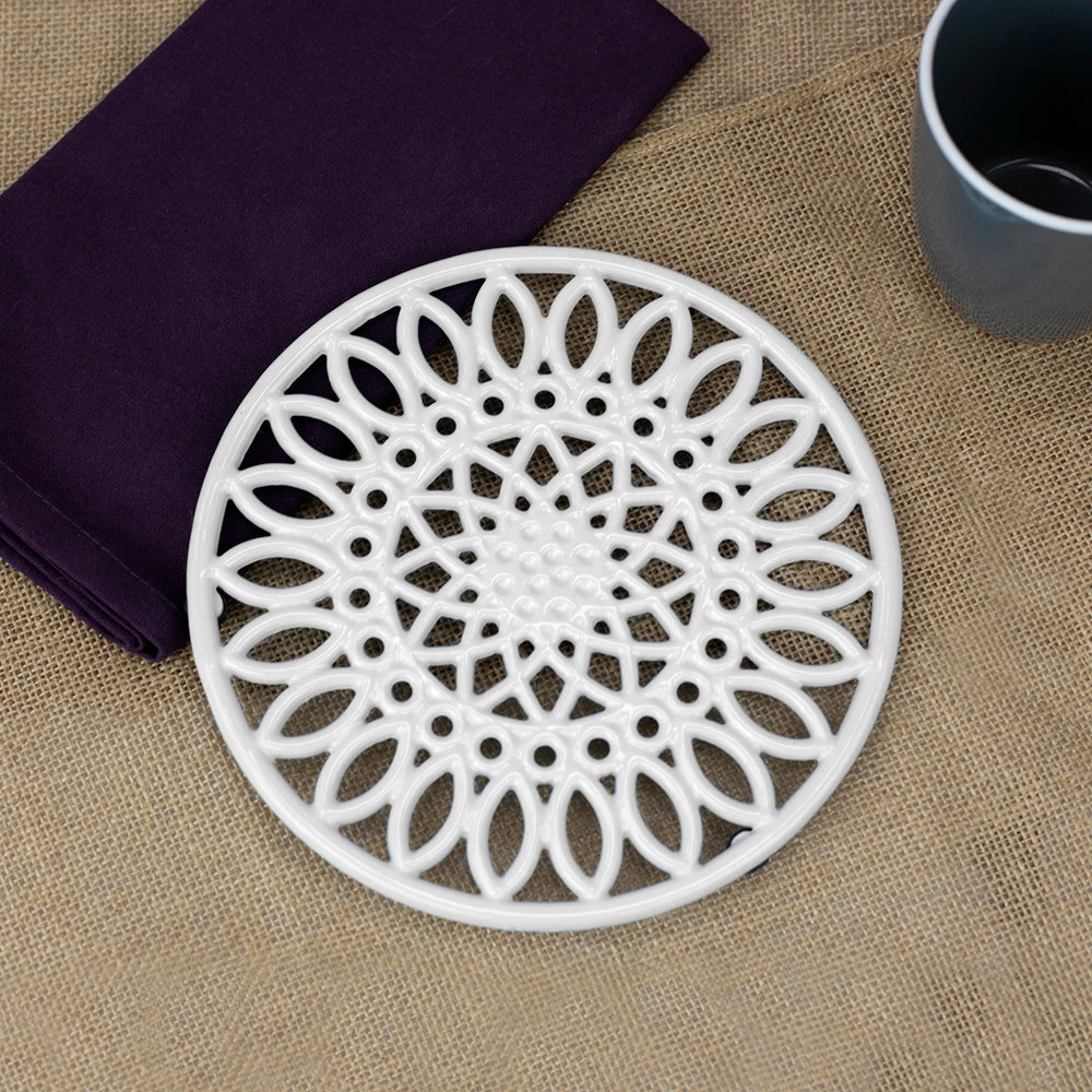 Add a touch of botanical bliss to your kitchen with the help of this sunflower inspired trivet. It is crafted from heavy weight cast iron with an enamel coating, and its durable construction allows it to withstand high temperatures to up 47 degrees C. Its ornate, sunflower pattern doubles as stylish tableware and makes it both a beautiful addition to the kitchen and dining room for both everyday use and special occasions. It has rubber feet at the bottom to keep the trivet in place and prevent scratches on your countertop. Use it for hot plates, or it can elegantly hold a cake or pie. Hand wash for easy maintenance.