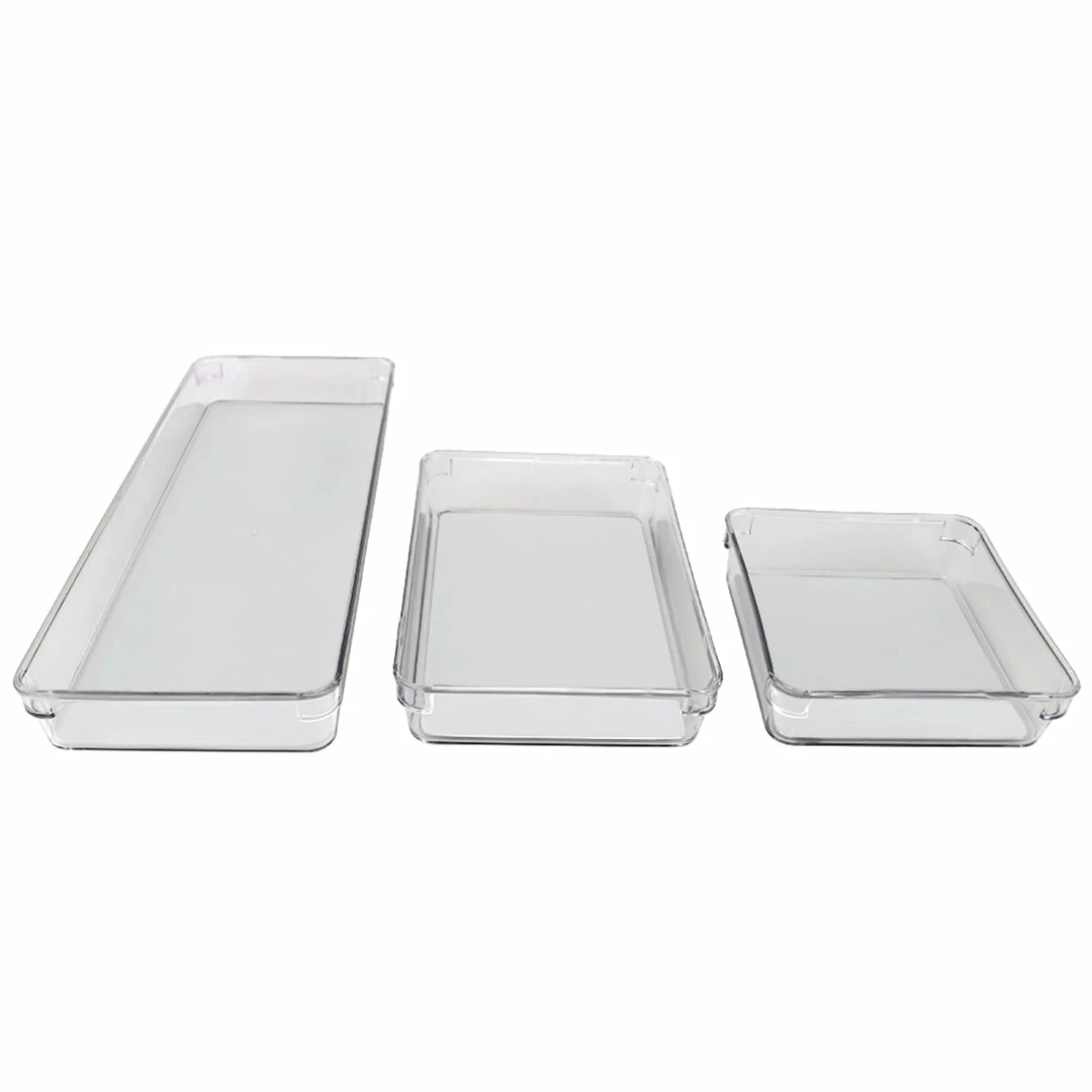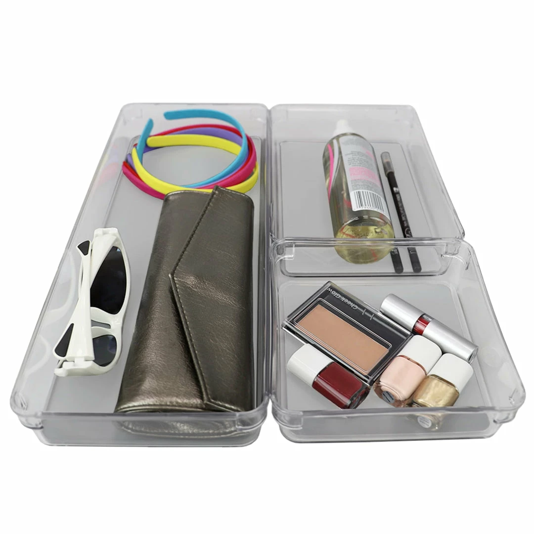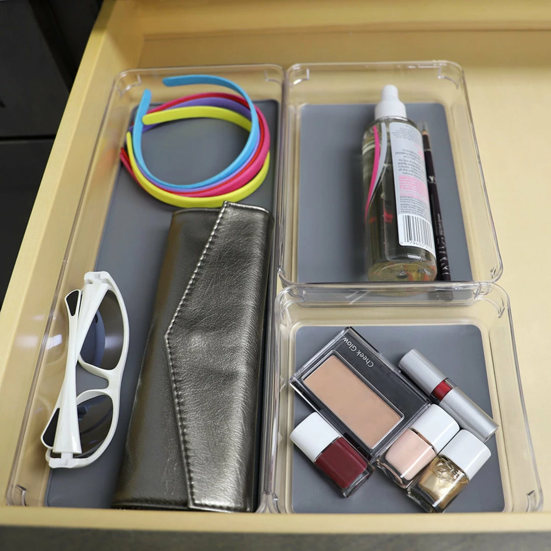 Tidy up junk drawers and easily find what you need, when you need it with this large capacity rubber-lined plastic drawer organizer set. The transparent material of the container makes it easy to see items within the tray at any angle, while the divided compartments make for quick and easy access sorting. The highly durable plastic and rounded corner design make it easy to wipe clean (or hand wash with mild soap and water). Great for storing office supplies, jewelry, small toiletries, small tools and make up. (Accessories not included).