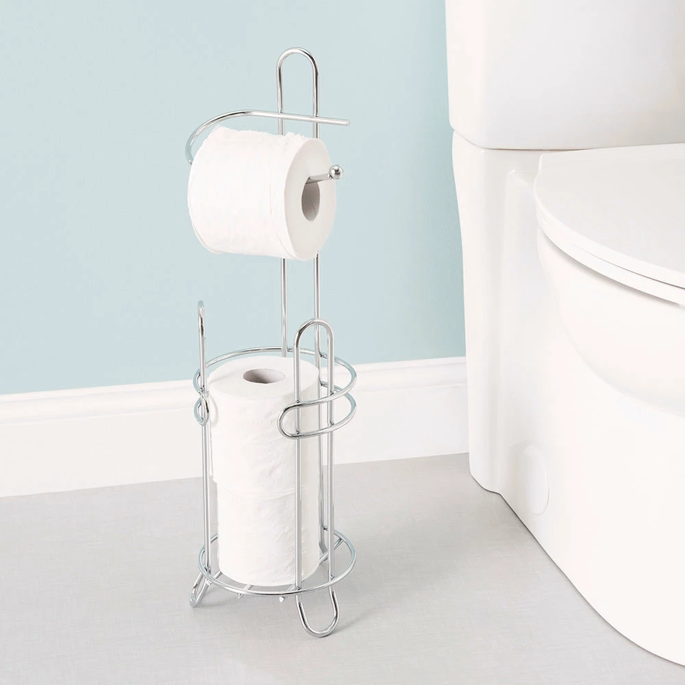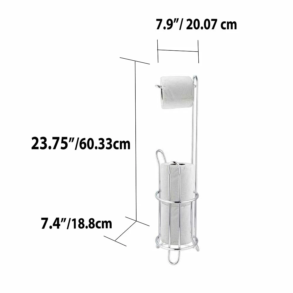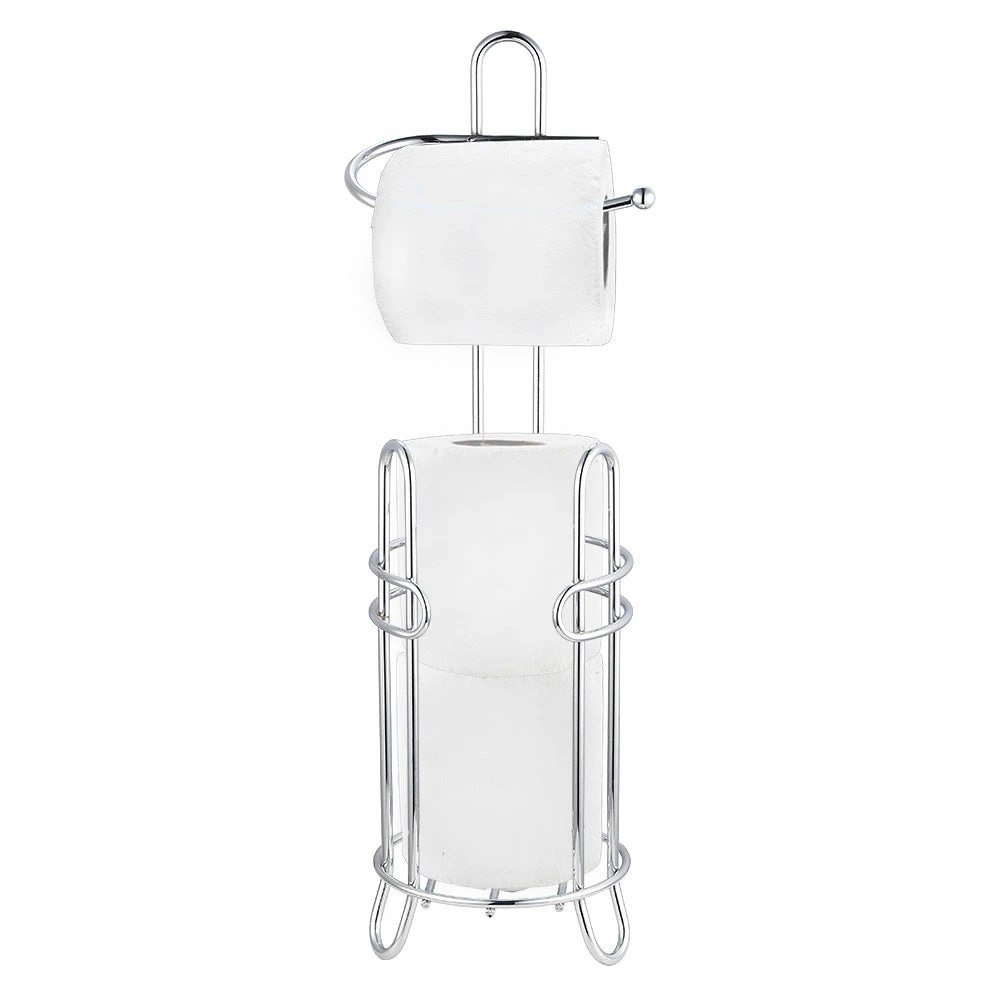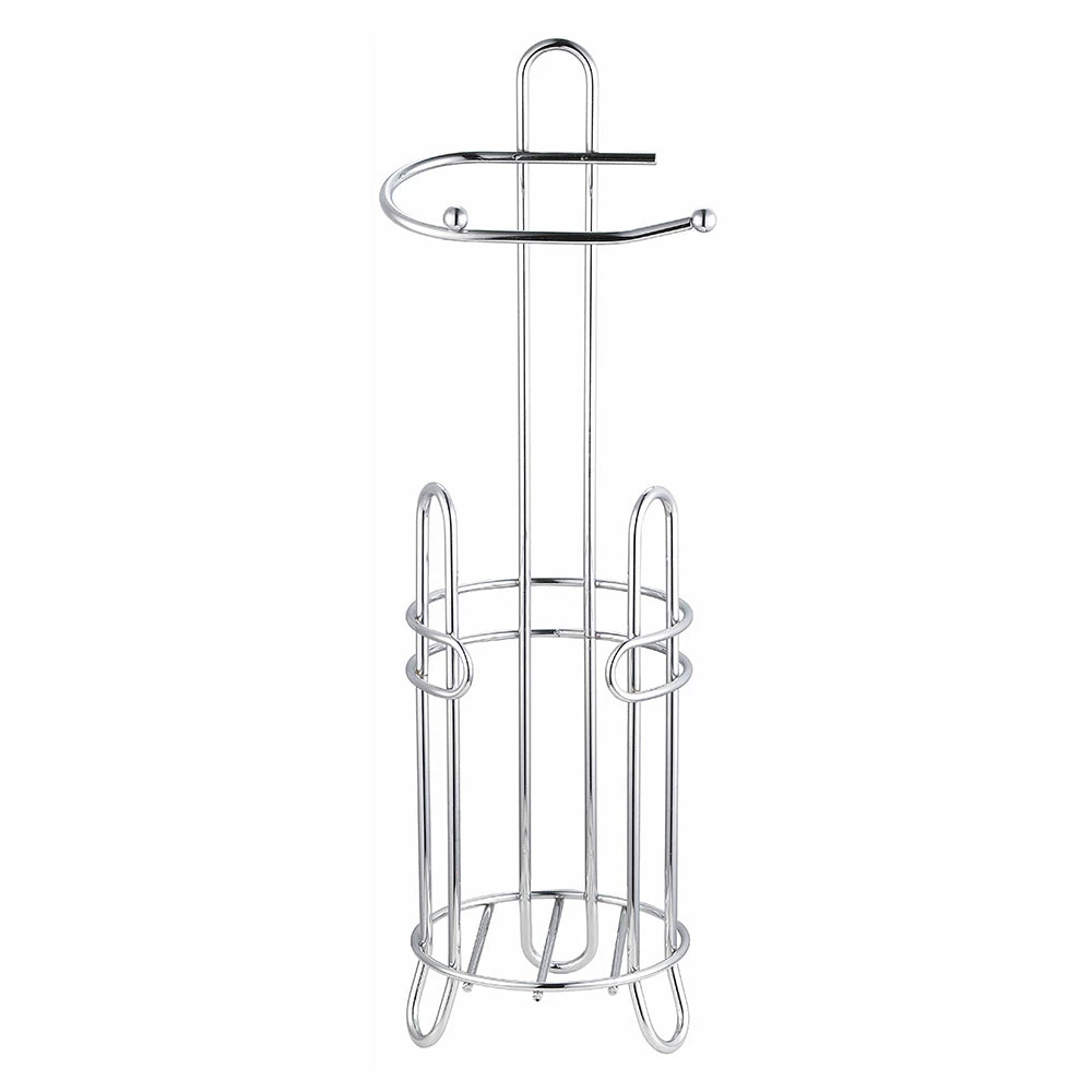 Graceful in design. But not dainty in construction. This chrome toilet paper holder and dispenser features a heavy duty design that is built to last yet slim in structure to fit in the corner of the bathroom or near a toilet. An open base cradles up to 3 spare rolls, so you’ll never have to worry about rummaging through your drawers or closet to find an extra. The open arm allows you to slip one toilet paper roll on the top to dispense and easily remove when needed