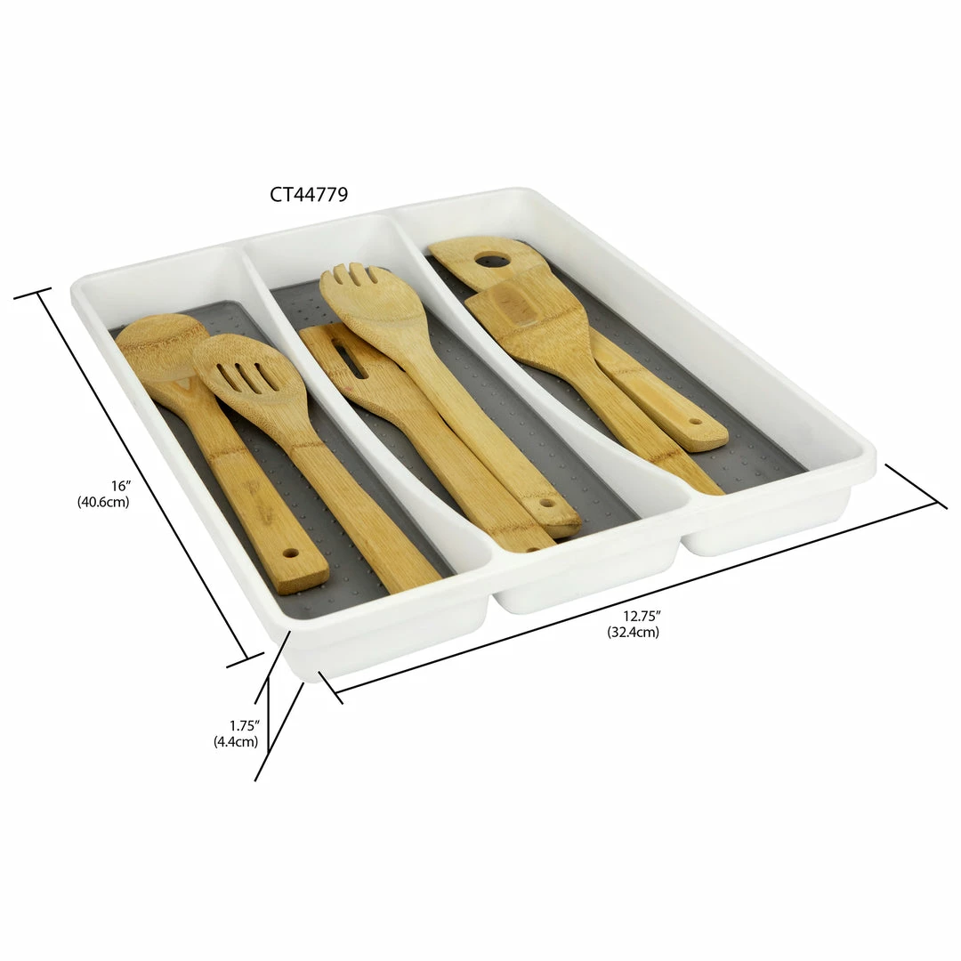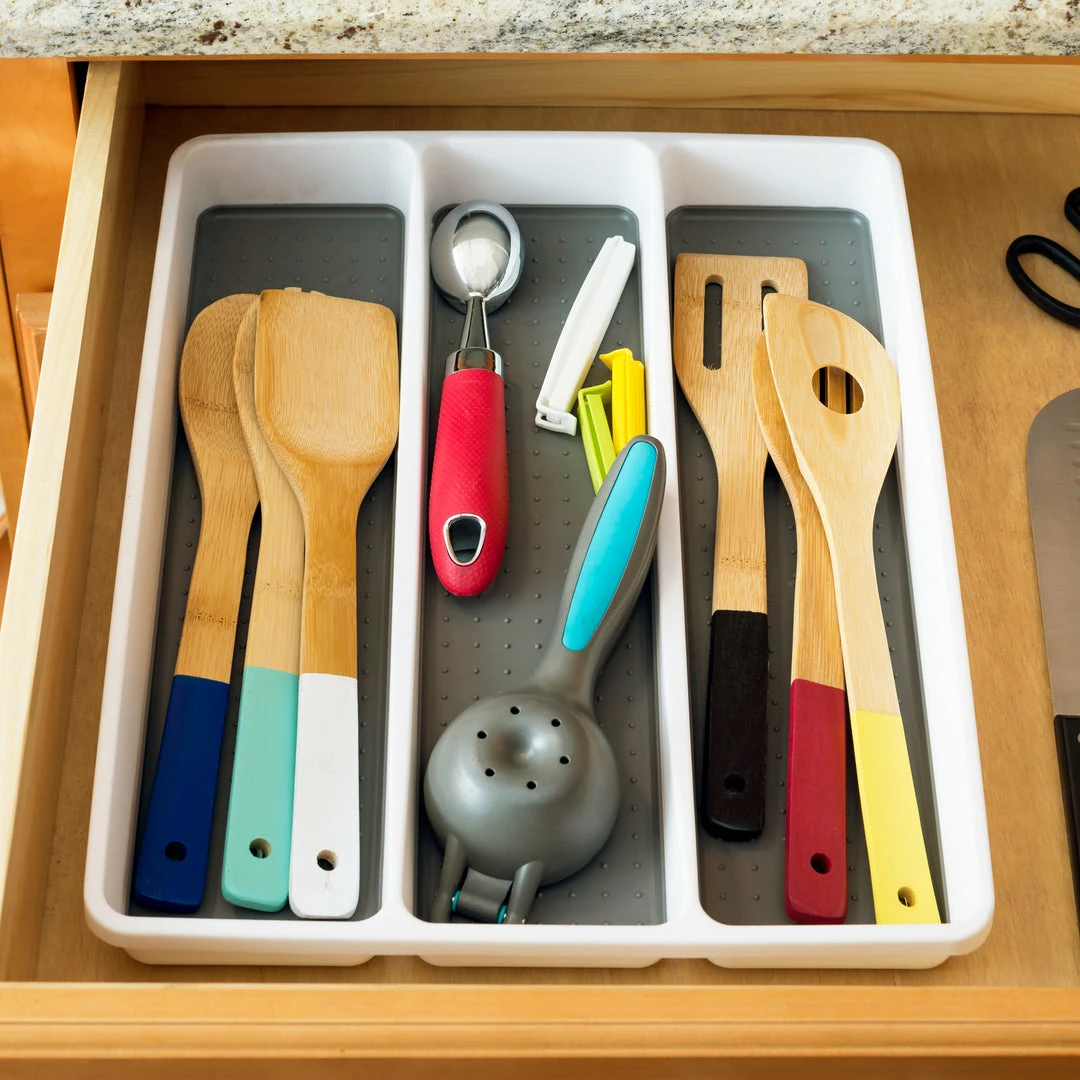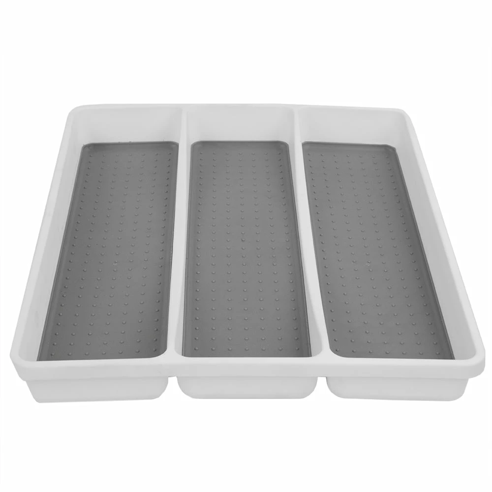 Store and organize all your kitchen tools in this cutlery tray. Made from durable plastic, it features 3 spacious compartments to house small kitchen utensils and cutlery as well as a rubber liner to keep everything in place.