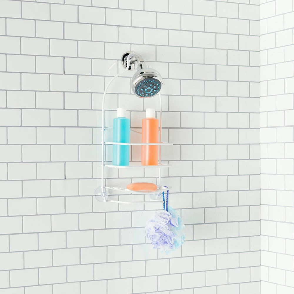 Perfect if you’re looking for a simple and sturdy solution for holding your basic shower essentials. This shower caddy is crafted with a thick, steel frame that is coated with a thick layer of vinyl to prevent rust and corrosion build up. With one shelf, you have room to hold an average size bottled shampoo and conditioner along with a small facial cleanser or shower gel. It also comes with compartment for bar of soap, with hooks at the sides for hanging loofahs, along with a lower bar for hang drying a face towel. No assembly is required, as there are back suction cups and a rubber-coated hook a the top that stick onto the bathroom tile and shower head. Hand wash to clean.