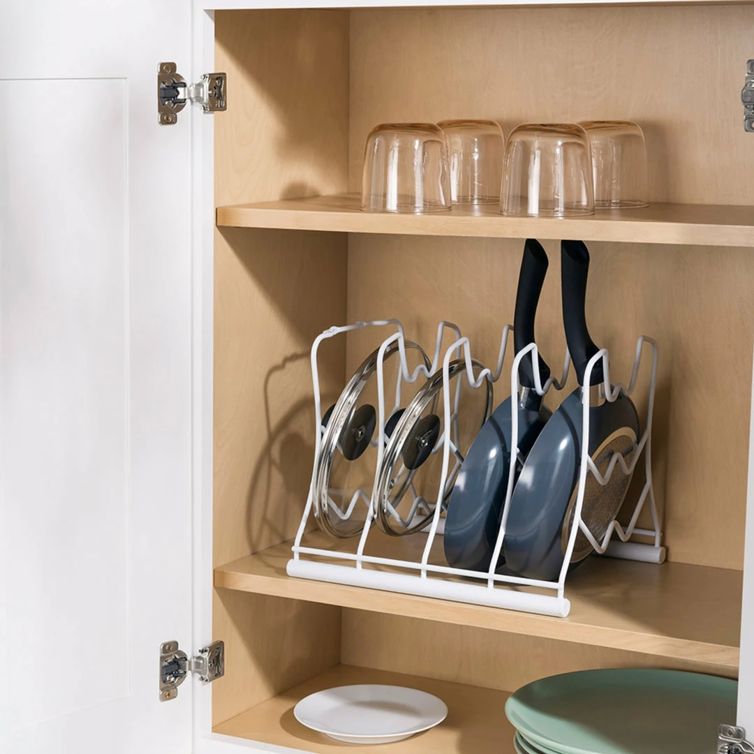 - Cookware rack neatly organizes pots, pans, lids in a vertical or horizontal orientation to maximize cabinet and counter space