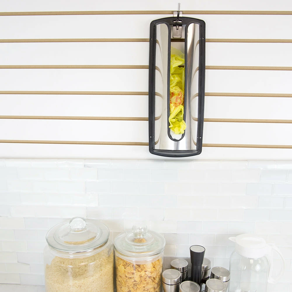Reusing plastic bags provides us a way to save the environment while also cutting down on grocery shopping costs. With cramped cabinets for other kitchen essentials, finding a place to store and have them easily accessible can be difficult. Enjoy maximizing your kitchen space, while having plastic bags readily available with this stainless-steel plastic bag organizer. It comes complete with screws and wall inserts for a quick install. It holds up to 20 plastic bags and is easy to refill and dispense. Simply tuck plastic bags on the top and pull a single bag from the bottom. Plastic bags are not included. Wall mounted install. Assembly is required. Hardware included. Screwdriver or drill not provided. Item dimensions may differ slightly due to the unique nature of the product. Color and finish may also differ from the images shown due to differences in monitor displays. Props and accessories are not included.