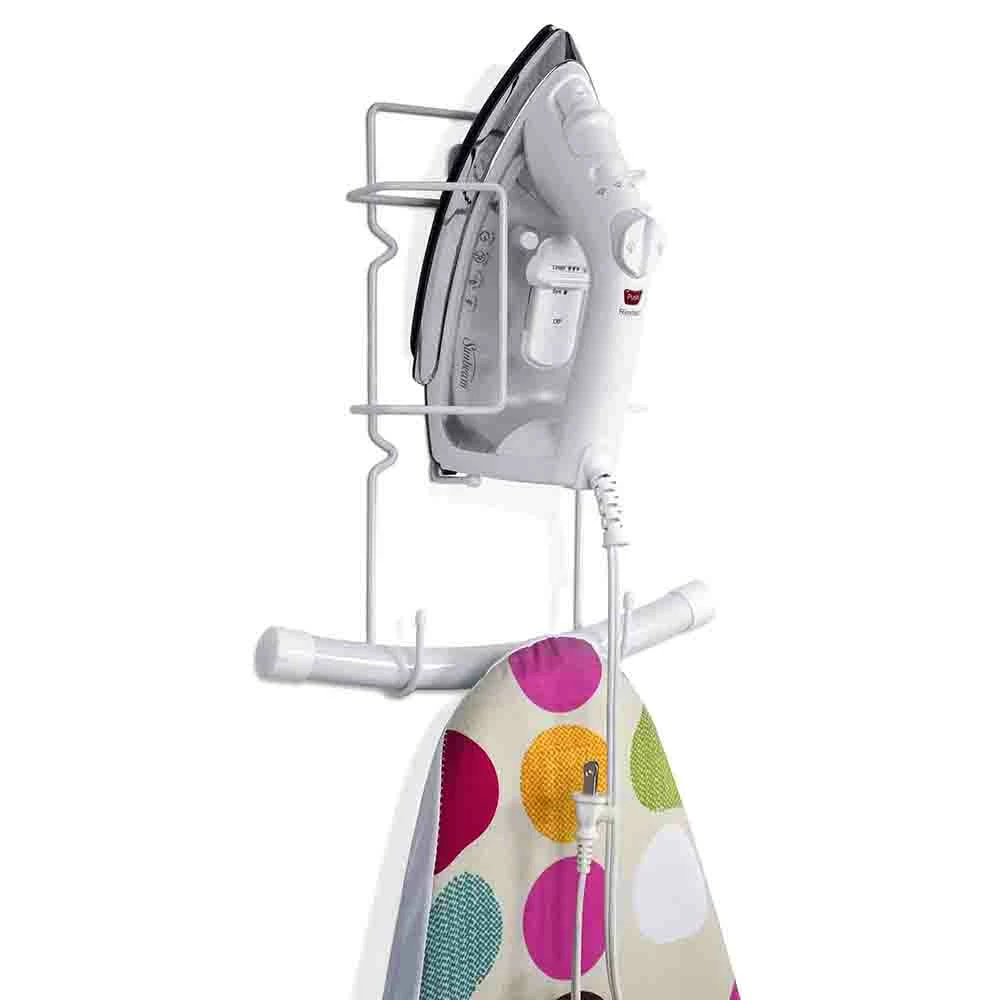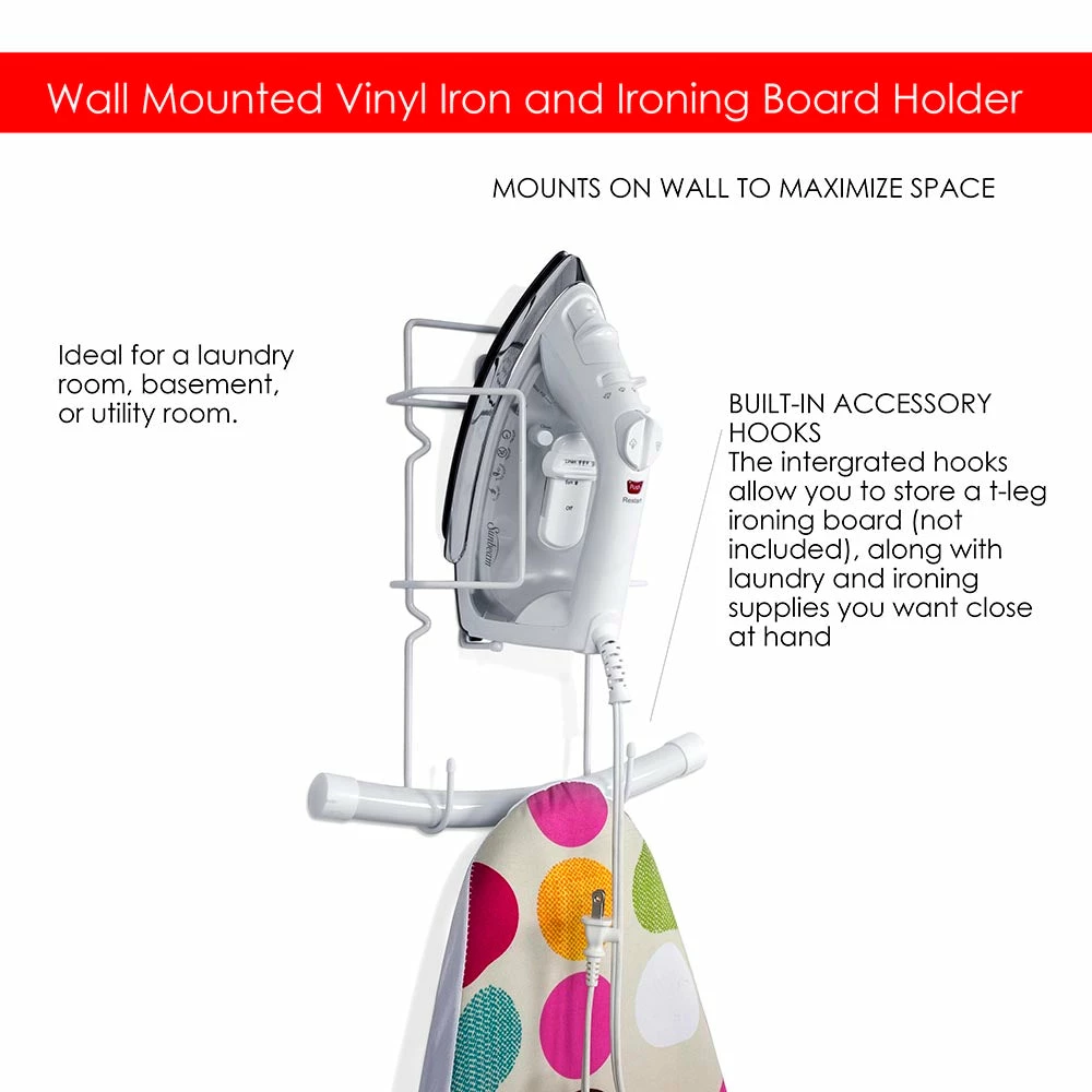 Store and organize your iron and the board with this hanging organizer. Made from vinyl coated steel with a rust resistant finish. Easy to clean. Ideal for a laundry room, basement, or utility room. Easily mounts to the main room door or the closet door.
