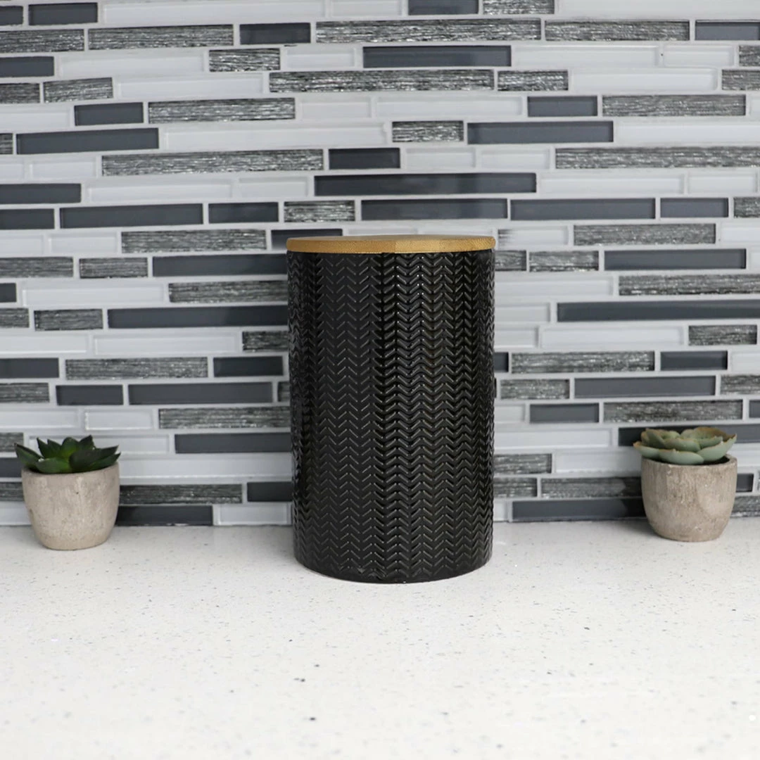 From pasta, flour, and spices to tea and coffee keep all your favorite pantry staples fresh and flavorful with this wave patterned ceramic canister with bamboo lid. The wave design adds a touch of texture while its smooth finish makes it easy to wipe clean. The silicone ring keeps air out, creating an air-tight environment to keep contents dry and free insects. A must-have for any kitchen, it matches any type of interior décor. Hand wash.