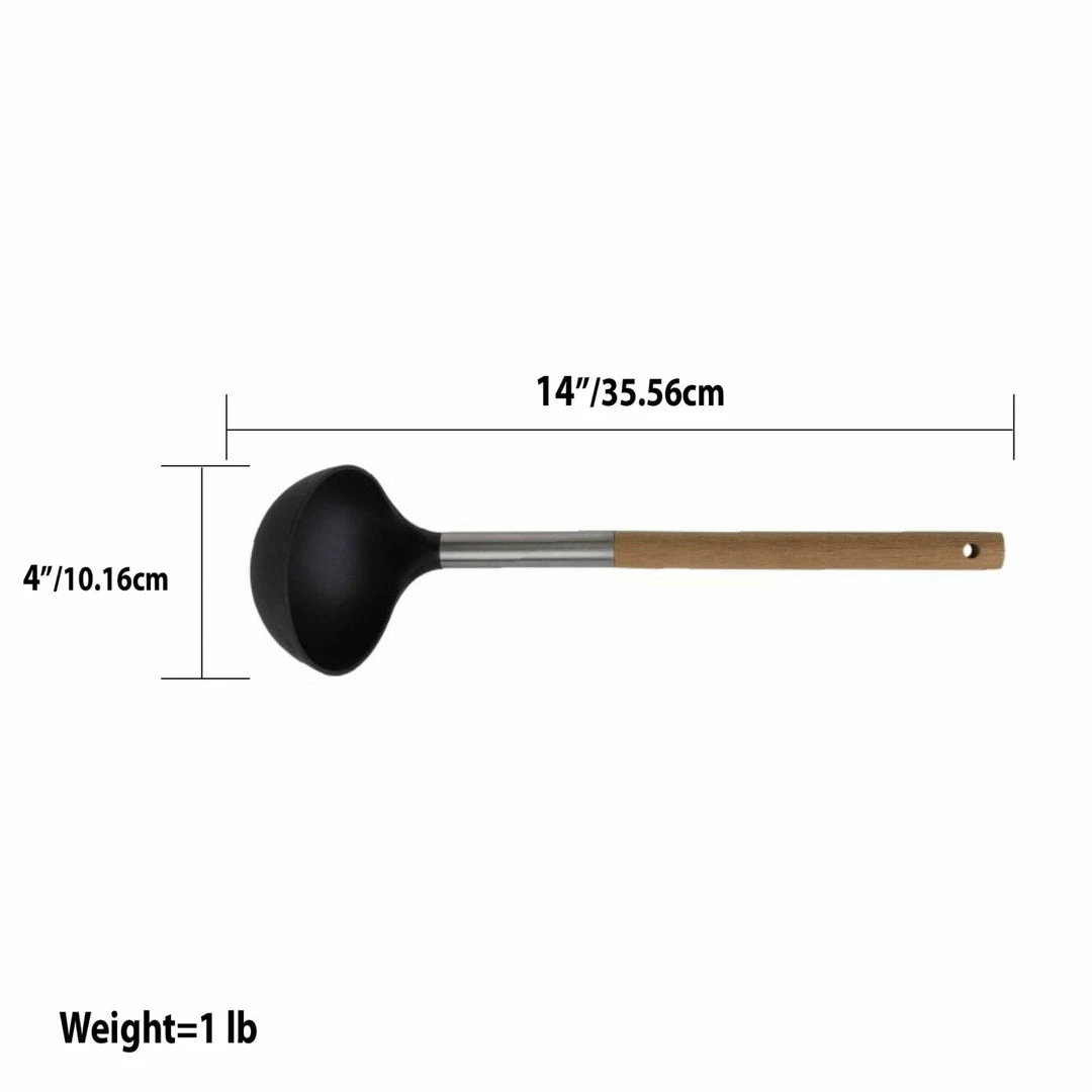 From cooking hot batch of stew to serving up holiday punch, this scratch-resistant ladle features a nylon head that is as robust as a steel but is safe to enough to use on non-stick, glass and enamel coated cookware. The wood handle is smooth to the touch, lightweight yet sturdy to take the strain from frequent flipping. Its deep bowl makes it great for scooping every ounce to feed a crowd. A convenient hanging hole located along the end of the handle to store away when not in use.