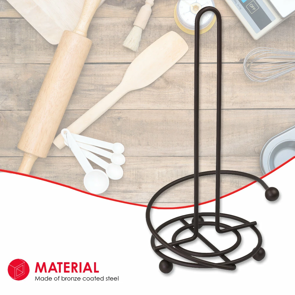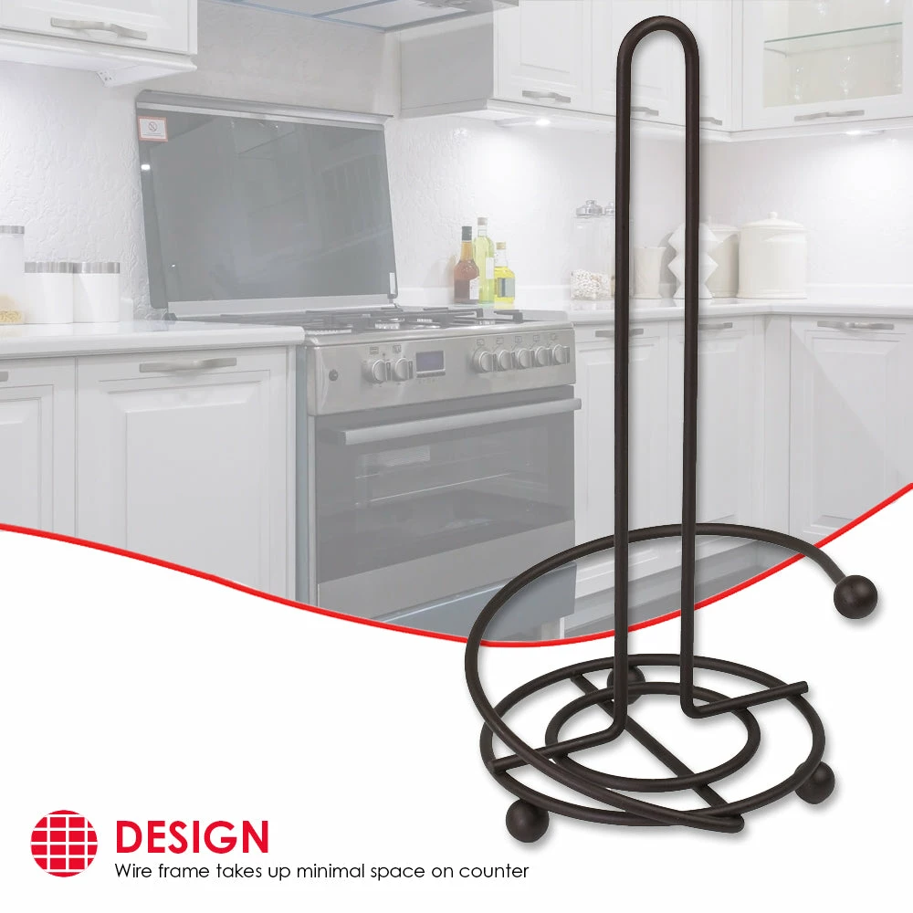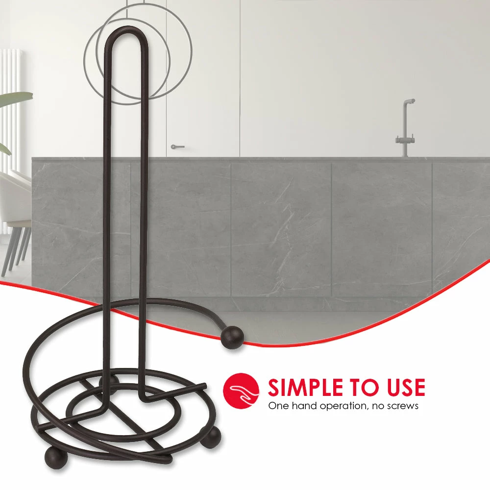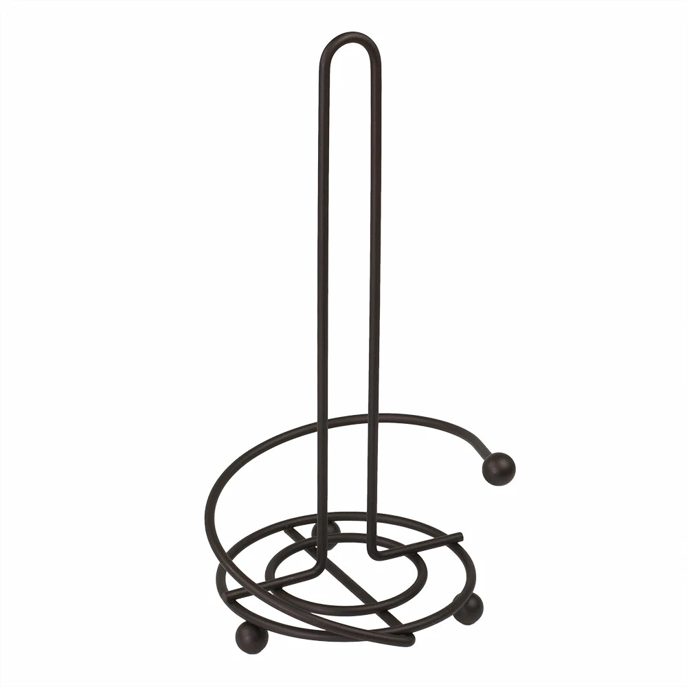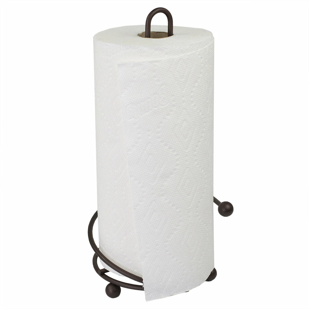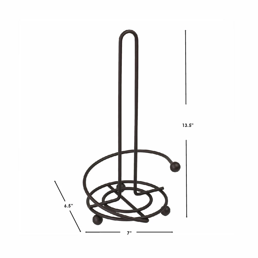 Add a touch of this class while keeping paper towels close at hand with this holder from the Wire collection. With its clean look and sleek curves, it doubles as a decorative piece. The freestanding design lets you easily place it any room where you need paper towels handy for everyday messes. It accommodates all sizes of paper towels, included jumbo sized! No need to untwist hard-to-open finals! This paper towel holder makes it easy to access paper towels. Simply slip a roll on the center post to refill. The base is rounded and weighted to prevent it from wobbling with non-skid bottoms for an added layer stability. The non-skid feet are slightly elevated to keep paper towels dry. A modern and practical paper towel holder– this definitely will fit the bill!