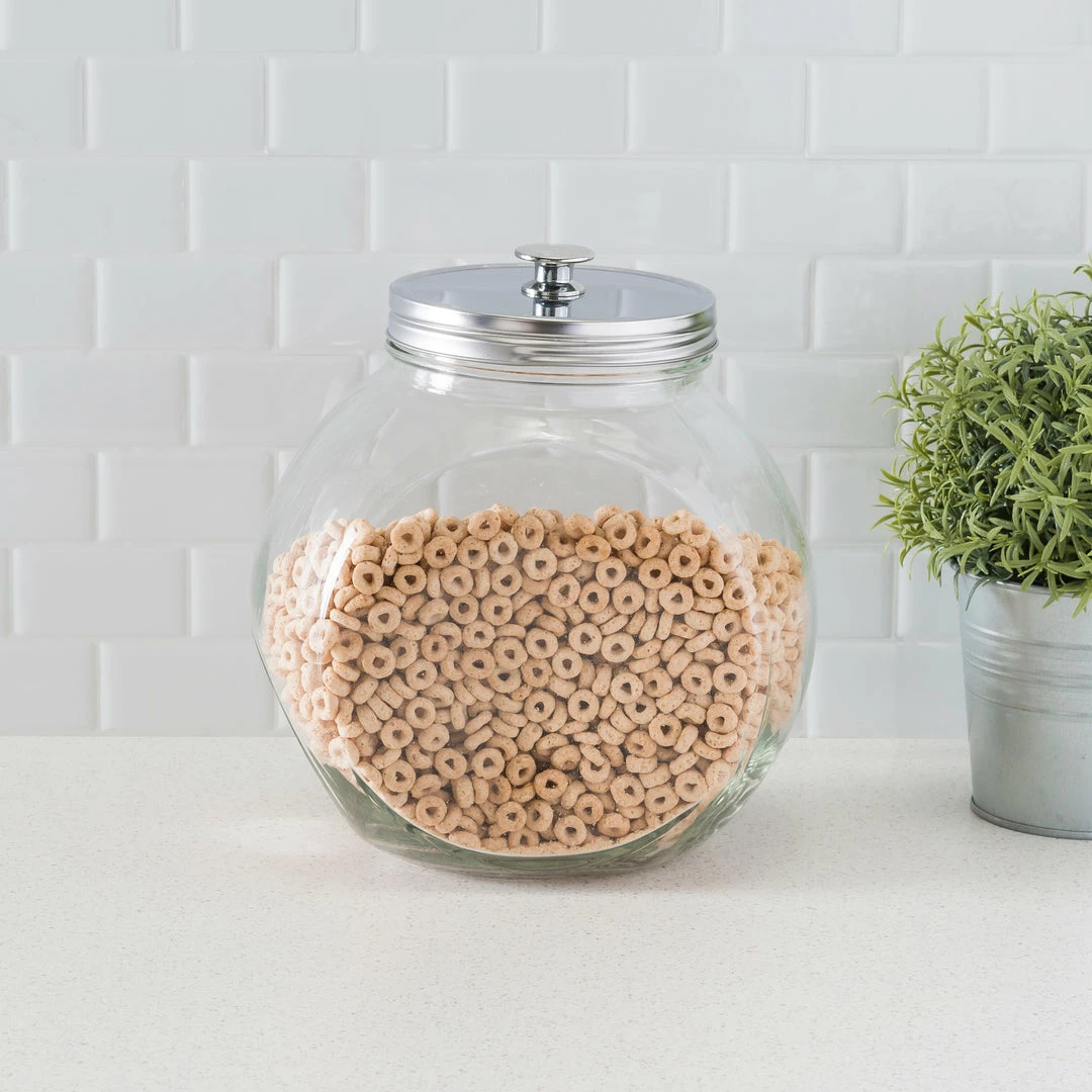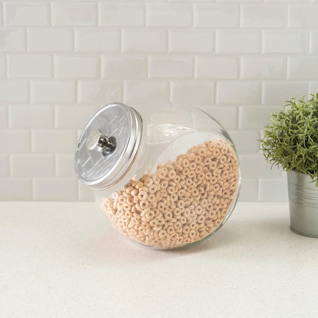Clear up the counter and welcome in a retro vibe to the kitchen with this traditional glass candy jar. With a 141 oz. capacity itβs big enough to store a generous portion of your favorite sweet treats without having to constantly refill. .But should you need to the clear glass makes it easy to know when itβs time stock up on your inventory. The stainless steel lid rests loosely on the top of the jar for easy removable. The wide mouth opening is perfect for easy scooping of items within the jar Put this versatile jar to work organizing a variety of items in the home in office, from your stash of coins to paper clips and other small office supplies.
